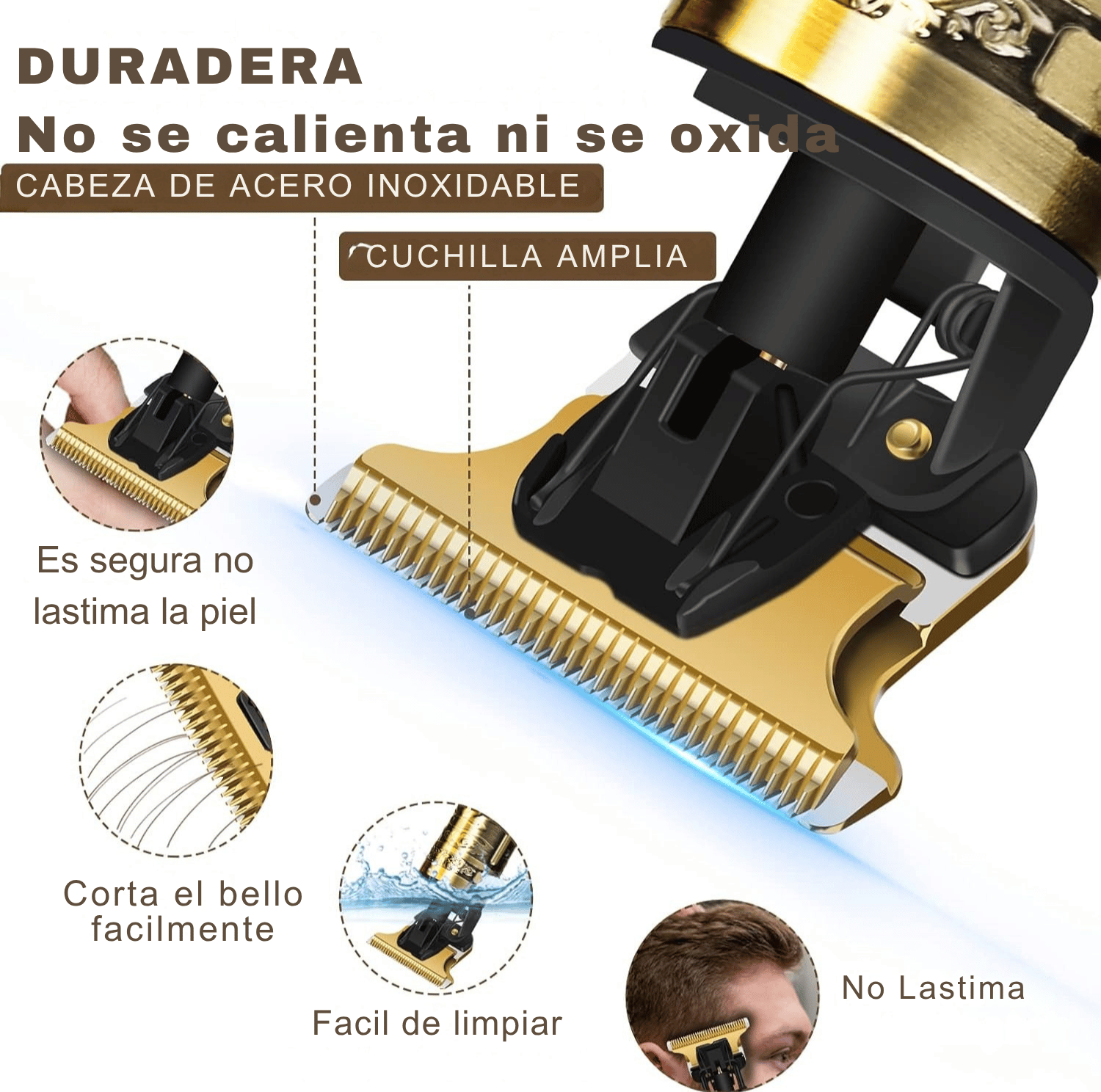 Cuchilla en T de acero inoxidable, motor silencioso de alto rendimiento y batería duradera con carga USB-C. Perfecta para definir, recortar y crear tu look profesional desde casa. -